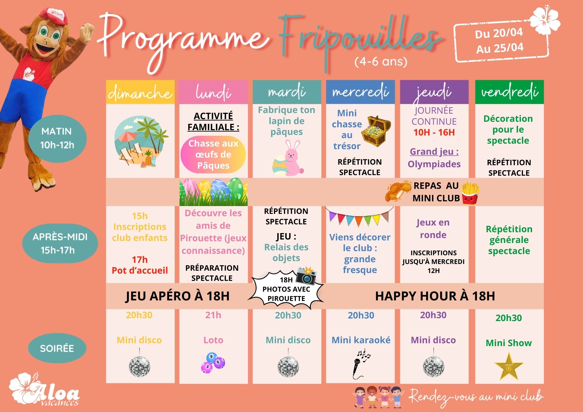 - Vacances d’avril : animations 6j/7 en journée et 7j/7 en soirée