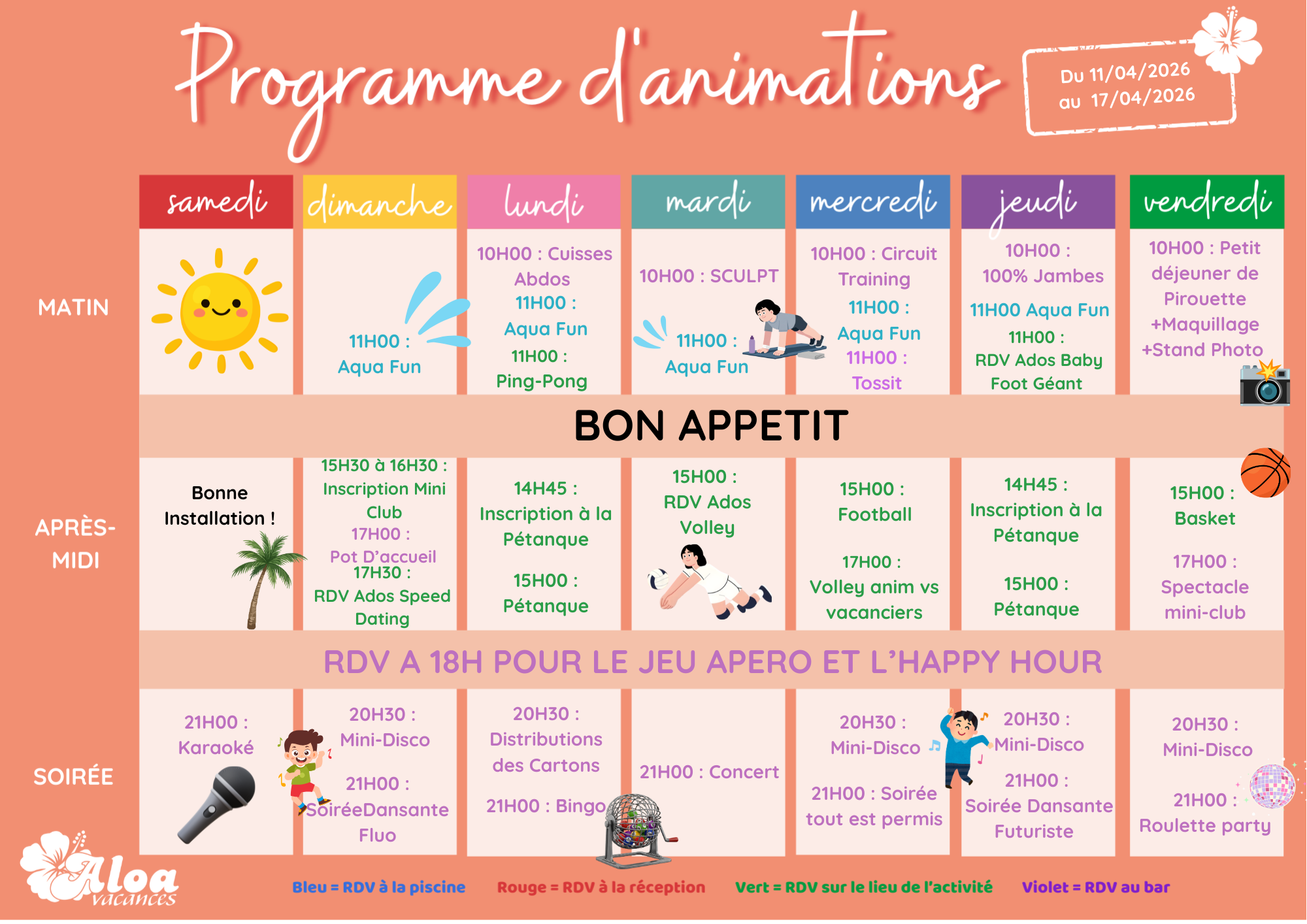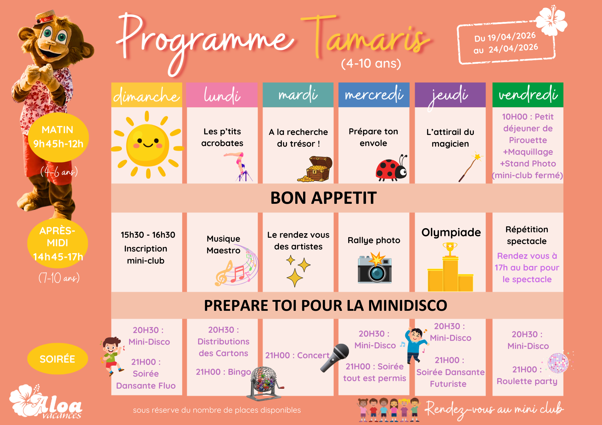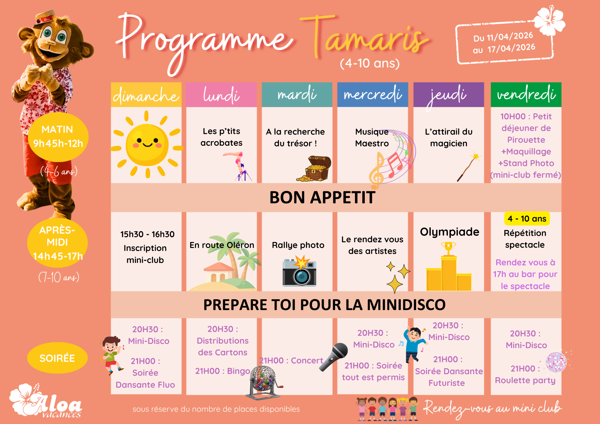 Votre mini club est ouvert du lundi au vendredi pour les 4-10 ans. Pour les ados âgés de 11 à 13 ans, ils se retrouvent le matin et pour les 14-17 ans l’après-midi ! (Sous réserve du nombre de places disponibles)