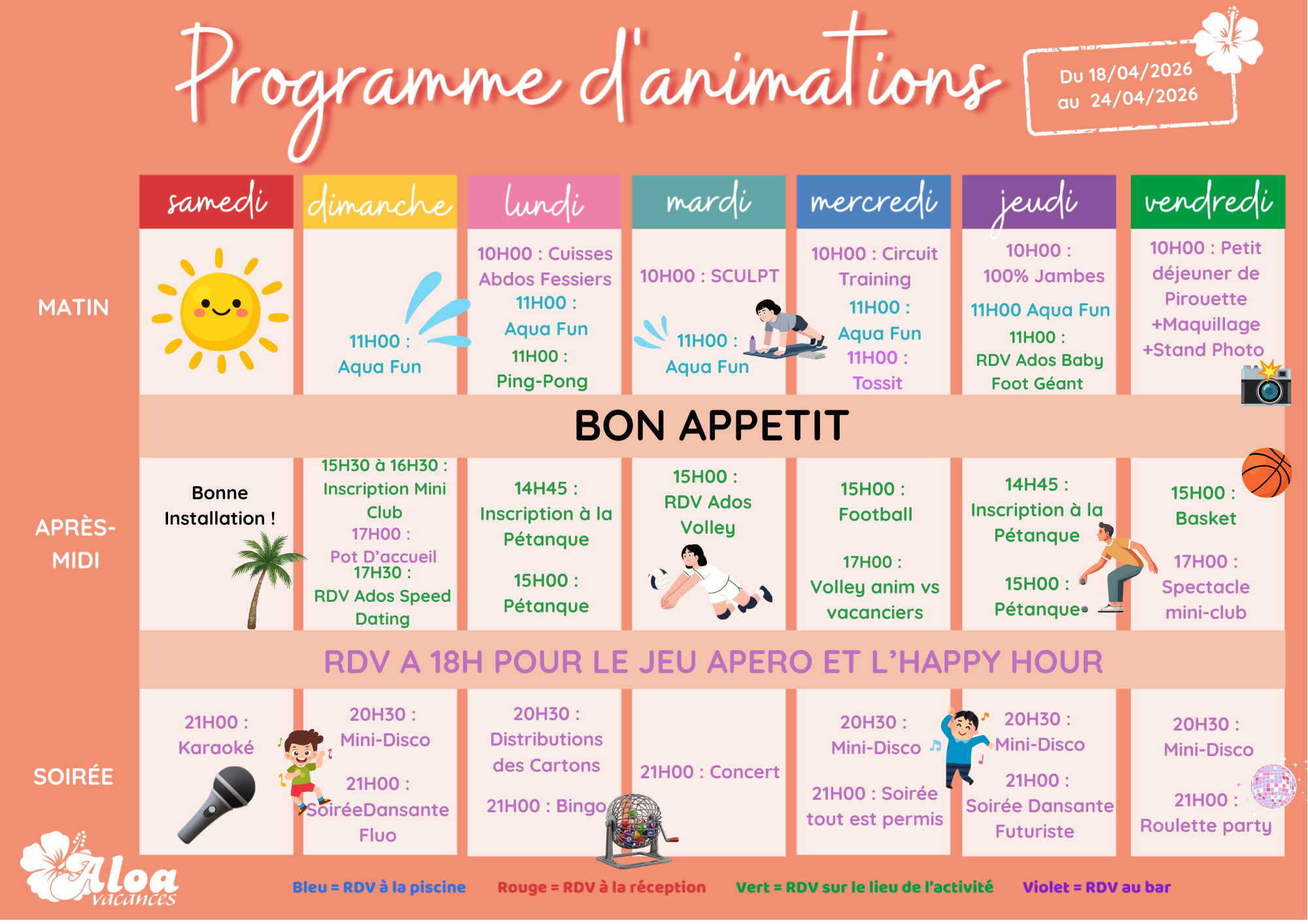 Dans une ambiance conviviale, tout au long de la journée, vos animateurs vous proposeront des animations bien-être avec l’aquagym, le réveil musculaire et des activités sportives avec de nombreux tournois sportifs : pétanque, football, beach volley.
